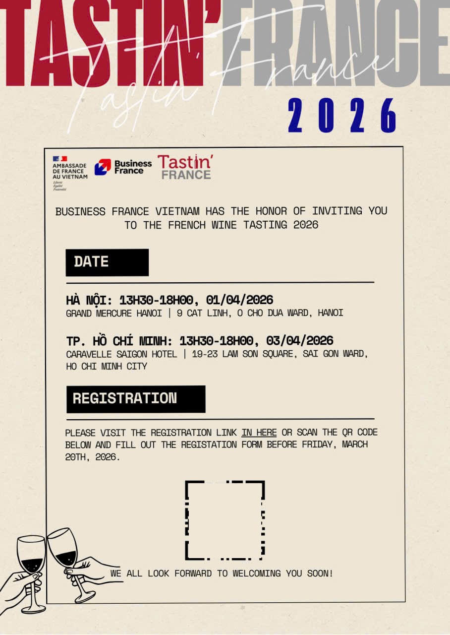 Sự kiện thử rượu vang Pháp thường niên do Business France tổ chức sẽ chính thức quay trở lại Việt Nam vào đầu tháng 4/2026, hứa hẹn mang đến một không gian giao thương và trải nghiệm đậm chất Pháp dành cho giới chuyên môn trong ngành rượu vang, ẩm thực và khách sạn.